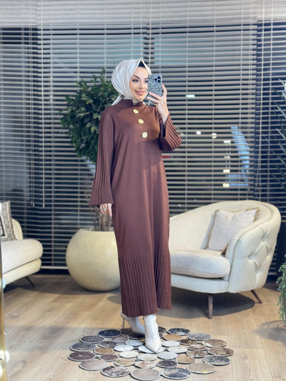 3507 Metal 3 Broşlu Triko Elbise Kahve