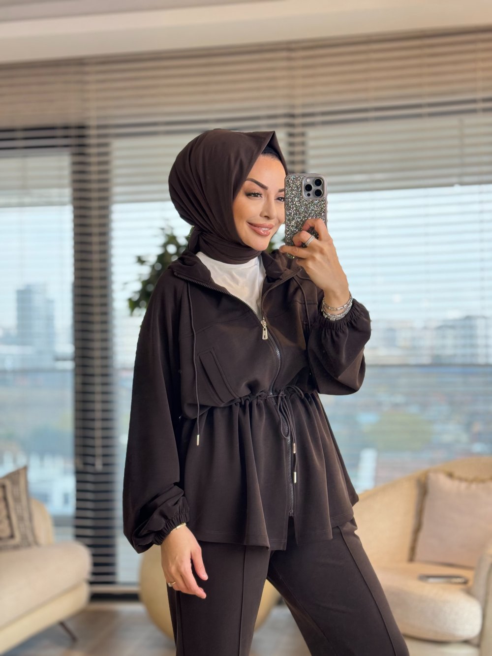 35373 Bel Kordonlu Kesik Detaylı Takım Kahve