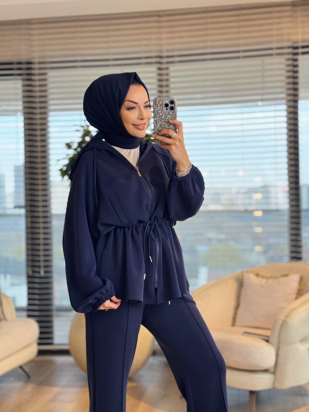 35373 Bel Kordonlu Kesik Detaylı Takım Lacivert