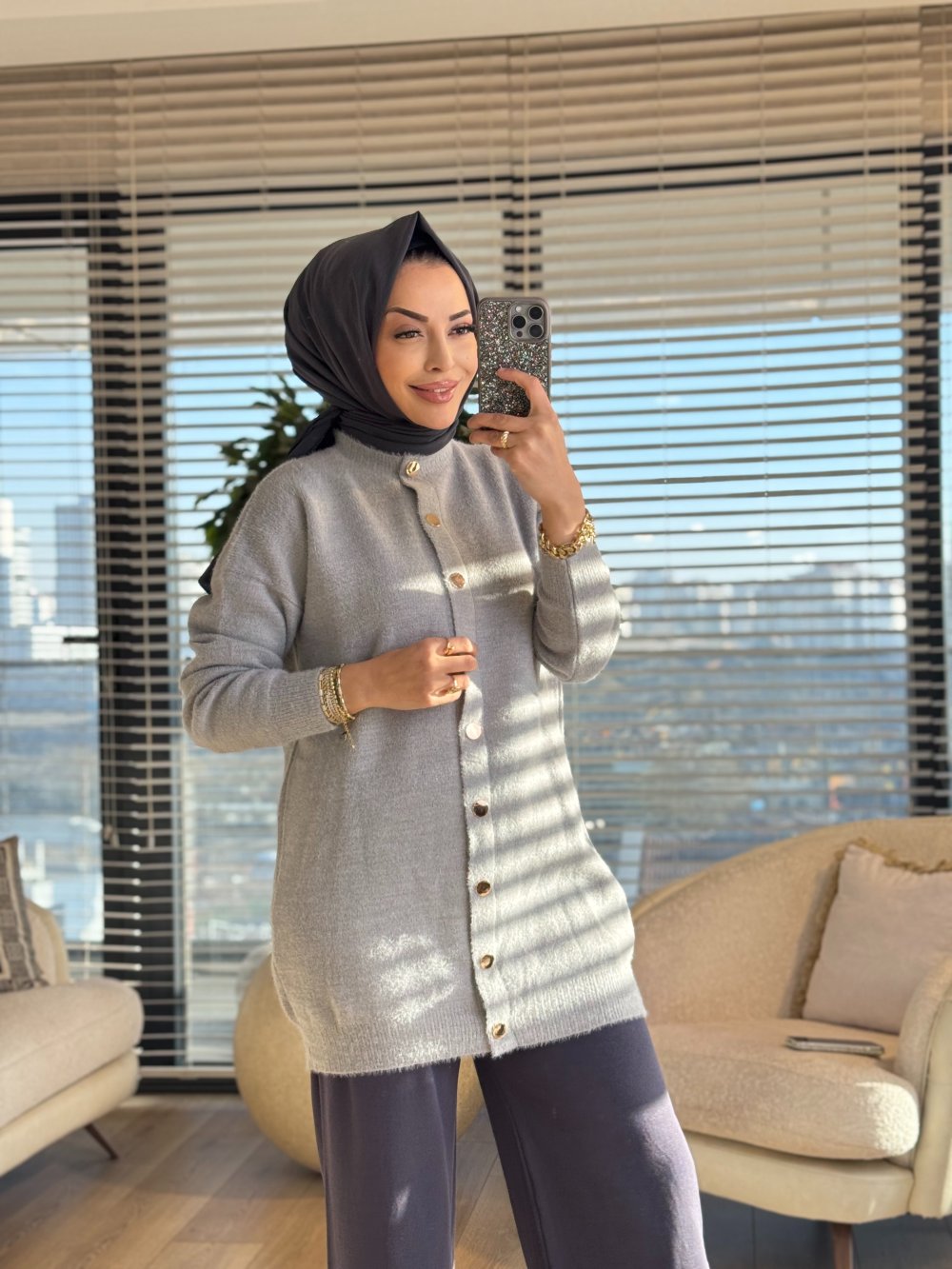 3539 Sakal Sıfır Yaka Çıtçıtlı Hırka Gri