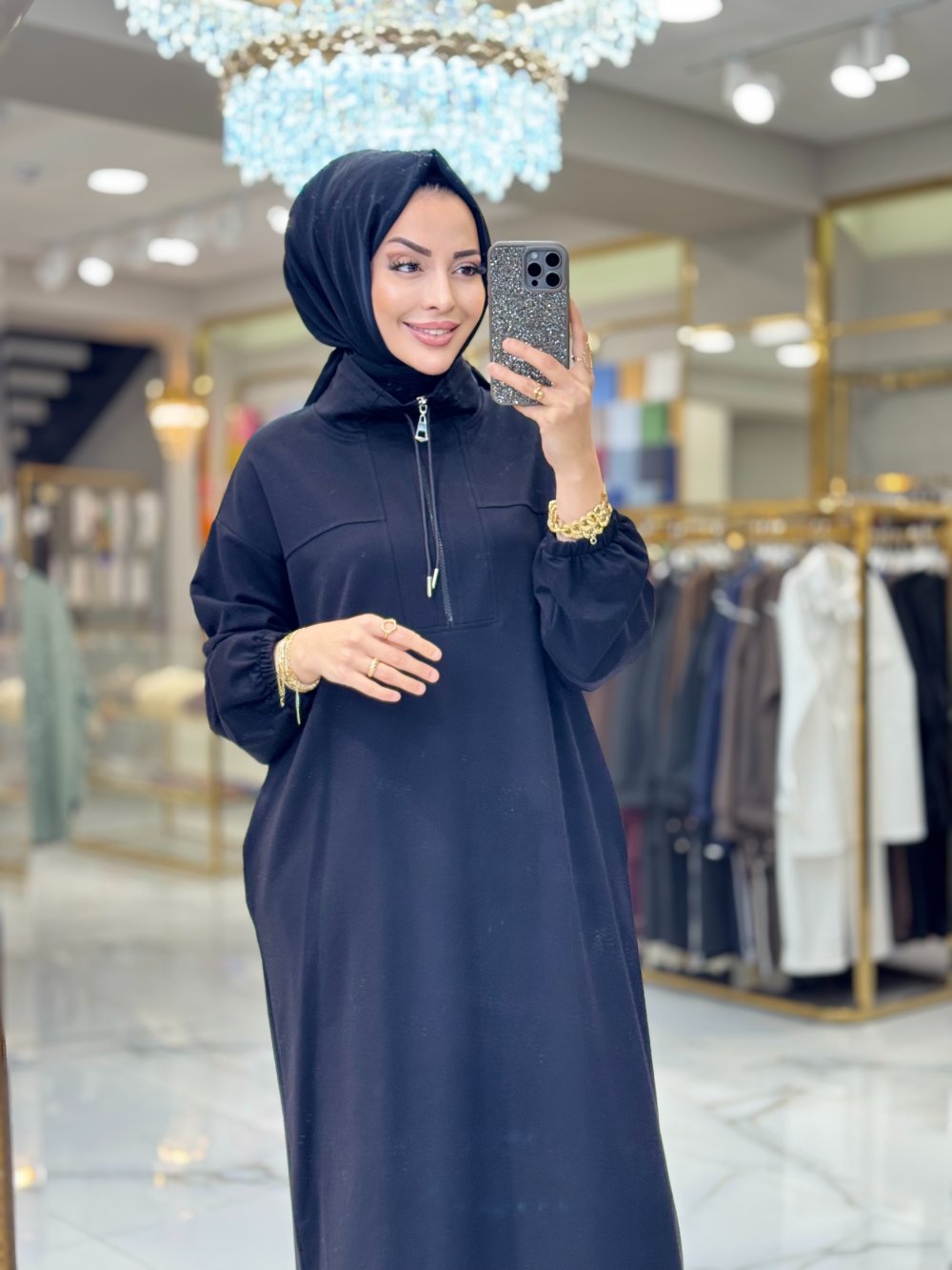 35742 Yüksek Yakalı Kesik Detaylı Elbise Siyah