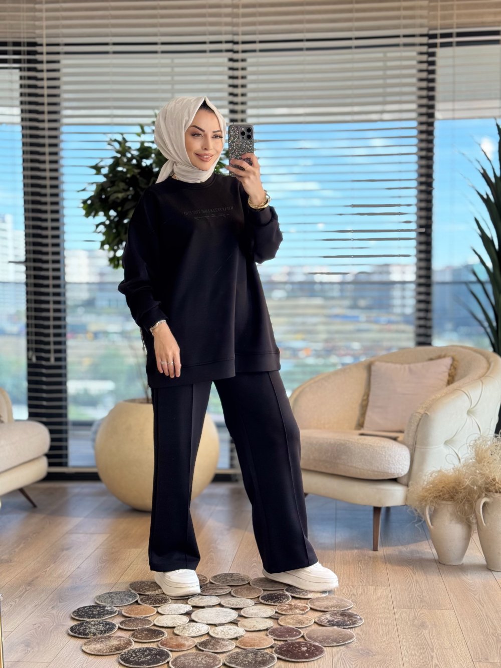 35798 Tonaton Baskı Geniş Paçalı Pantolonlu Takım Siyah