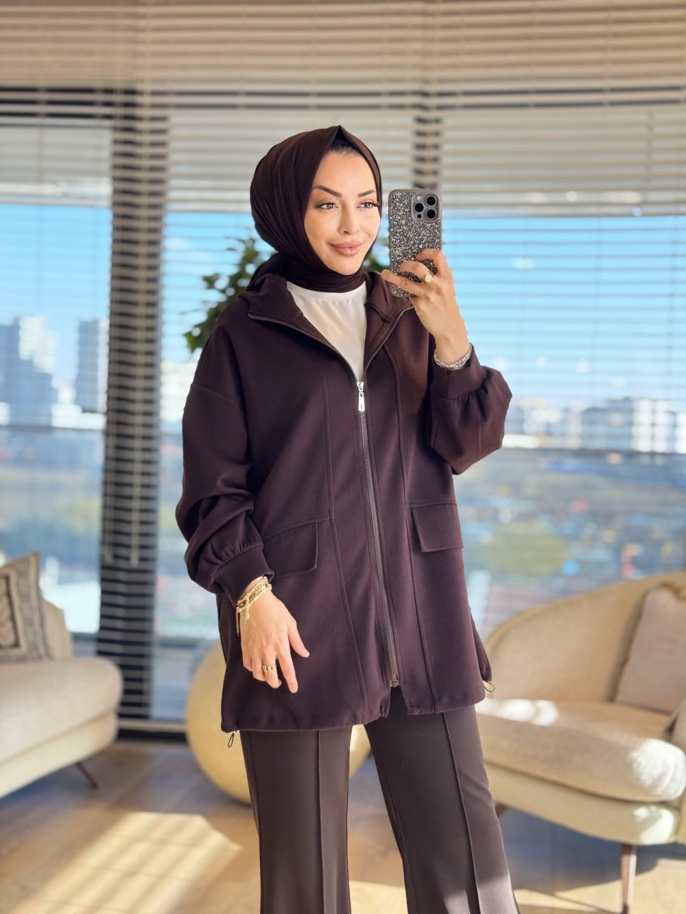 35901 Kesik Ve Cep Detaylı Bomber Ceket Kahve