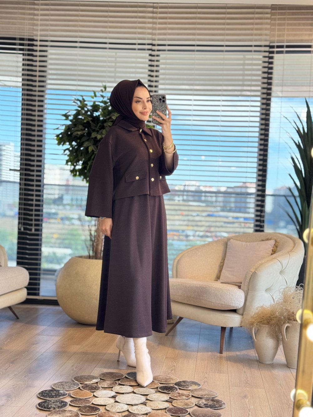 36053 Cep Detaylı Düğmeli Etekli Takım Kahve