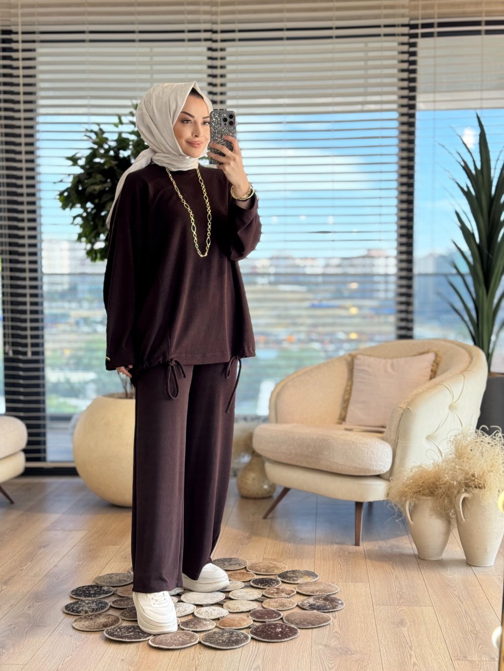 36068 Pile Detaylı Pantolonlu Takım Kahve
