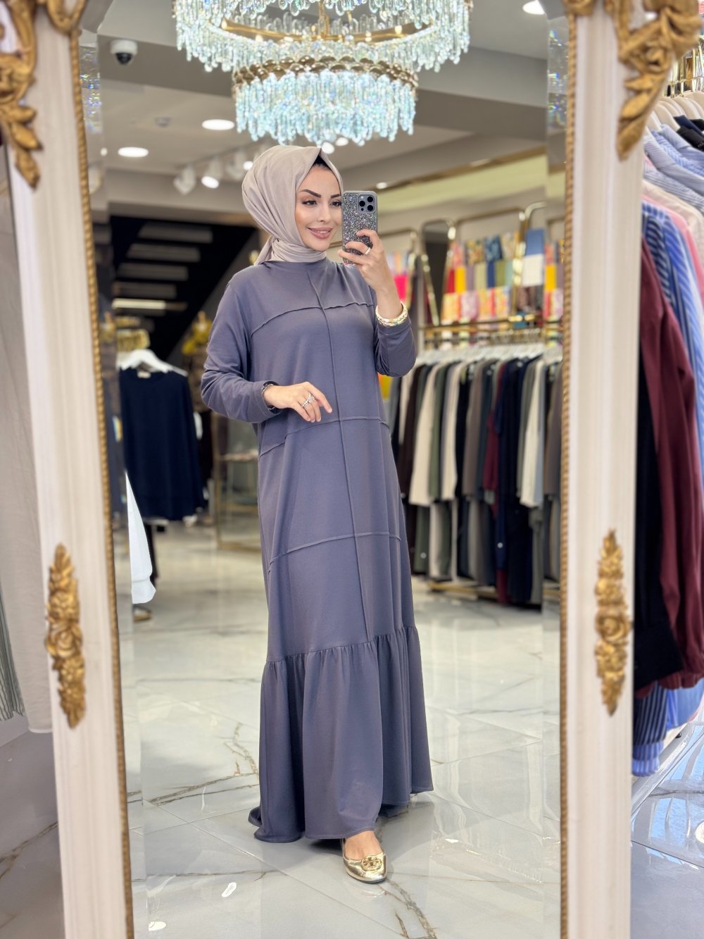 3947 Nervürlü Kristal elbise Antrasit