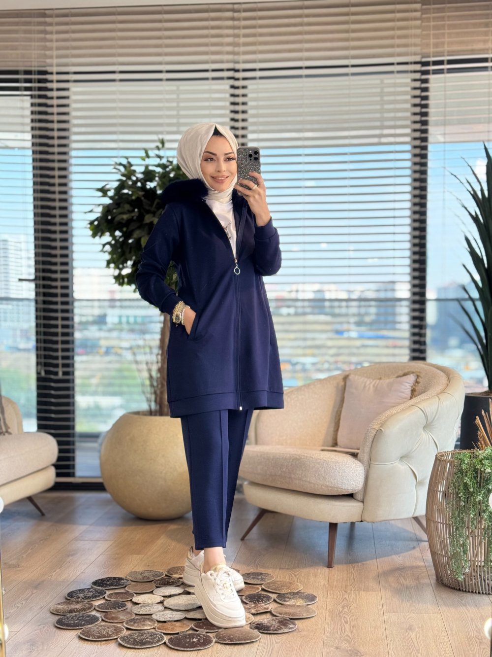 3950 Yaka Kürklü Fermuarlı Takım Lacivert