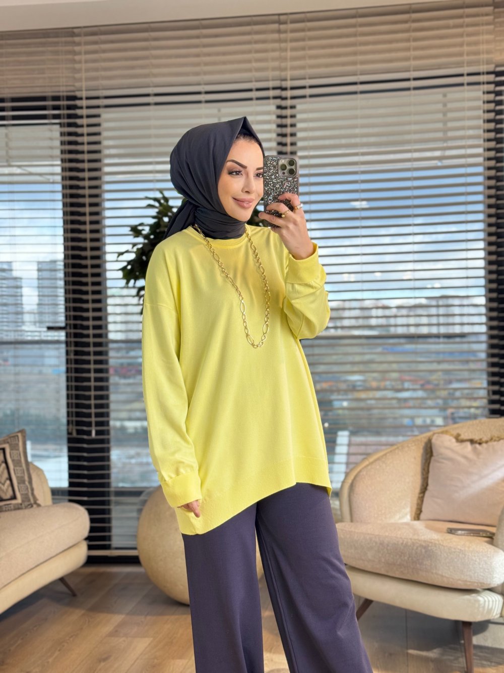 40408 Kolu Katlamalı Sıfır Yaka Tunik Sarı