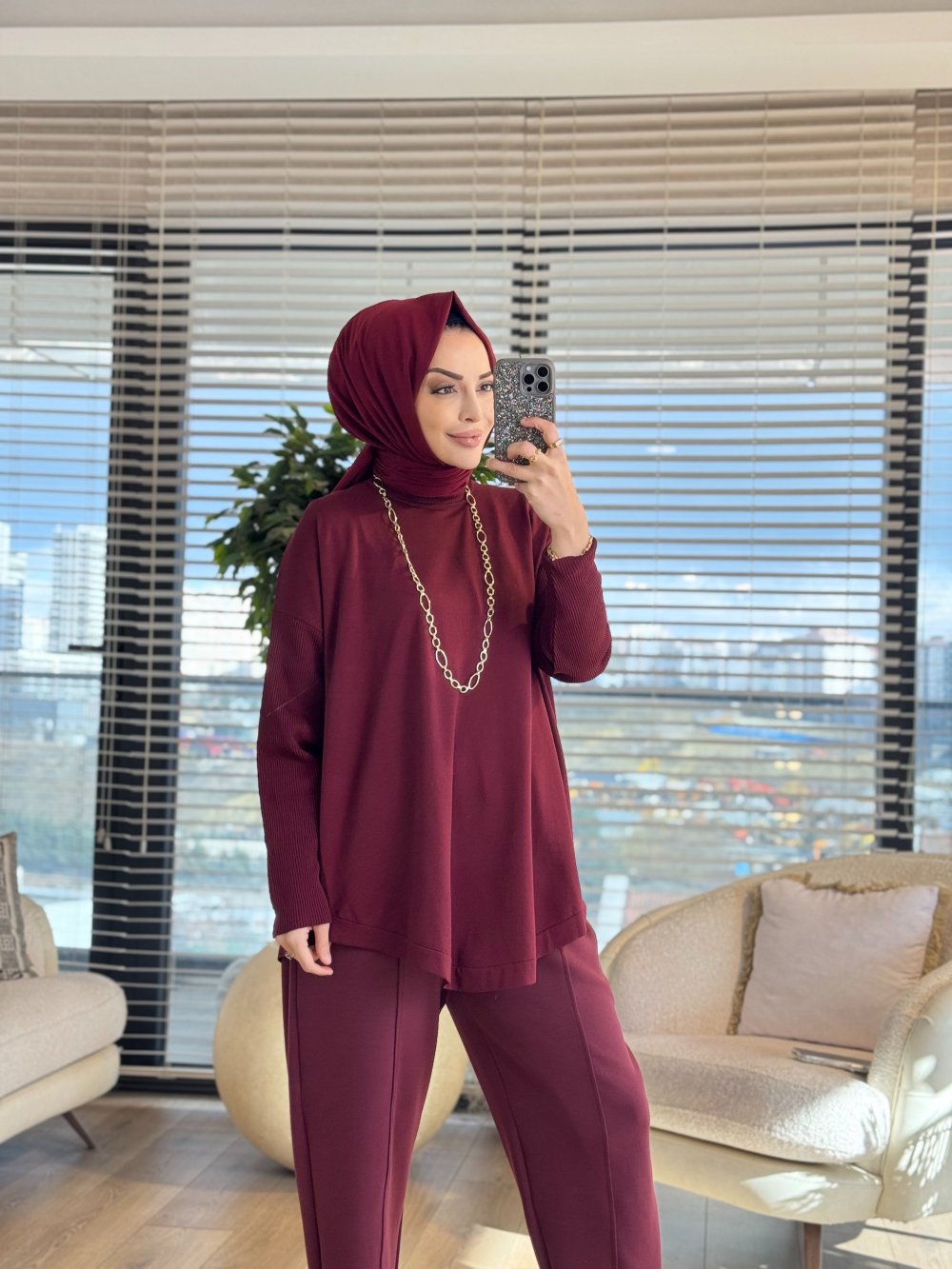 40972 Kolları Lastik Örgü Triko Tunik Bordo
