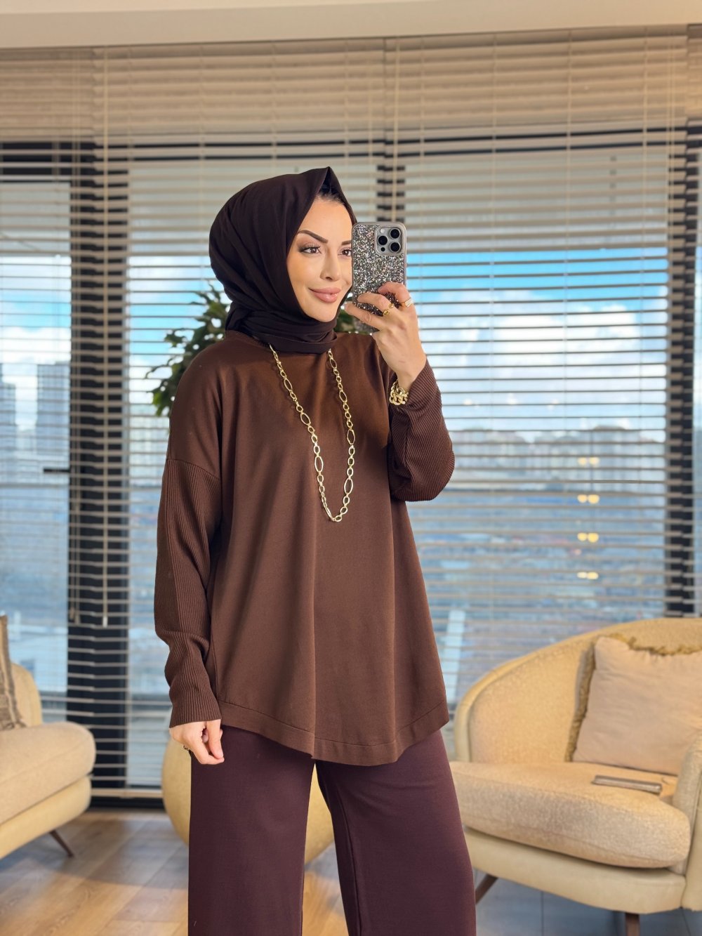 40972 Kolları Lastik Örgü Triko Tunik Kahve