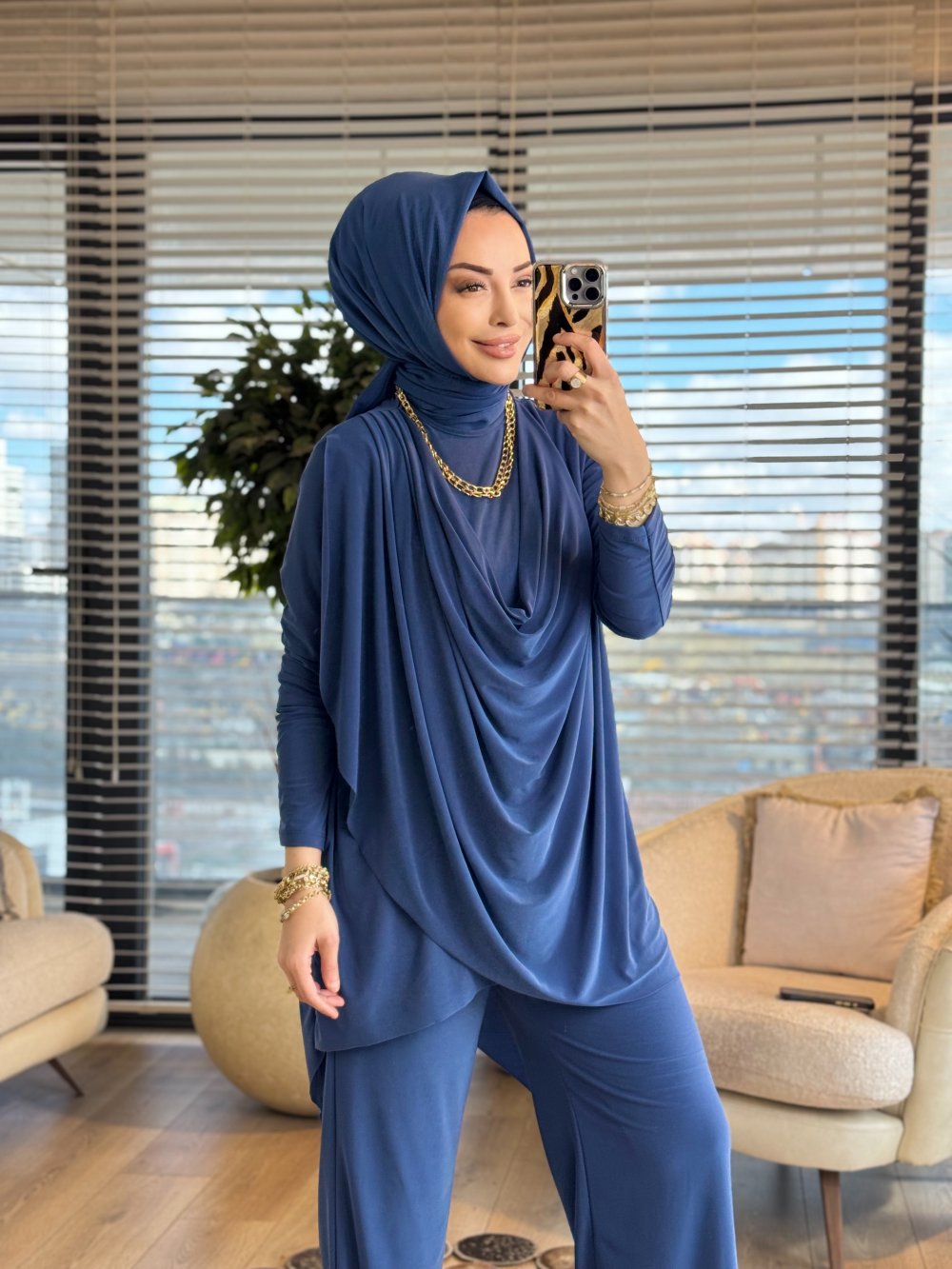 4201 Omzu Pileli Önü Dökümlü Sandy Takım İndigo