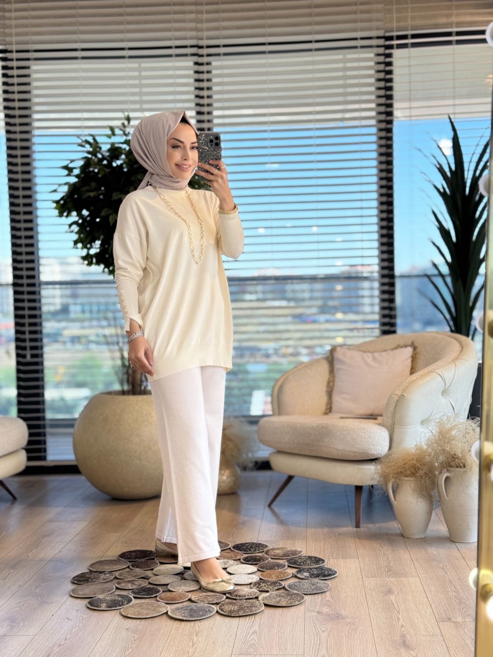 44016 Manşeti Çıtçıtlı Triko Tunik Ekru