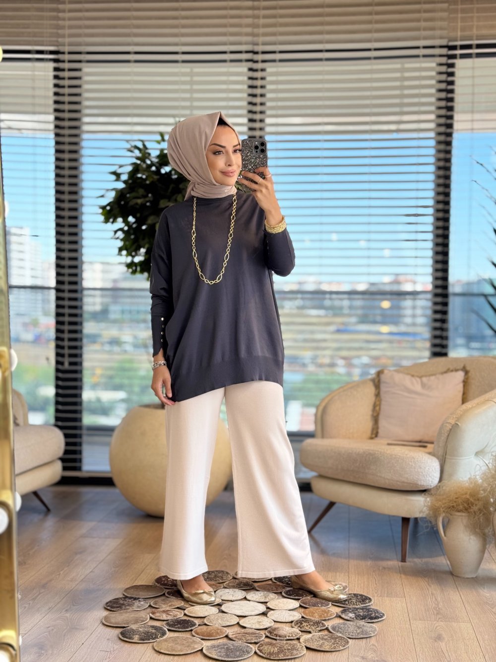 44016 Manşeti Çıtçıtlı Triko Tunik Füme