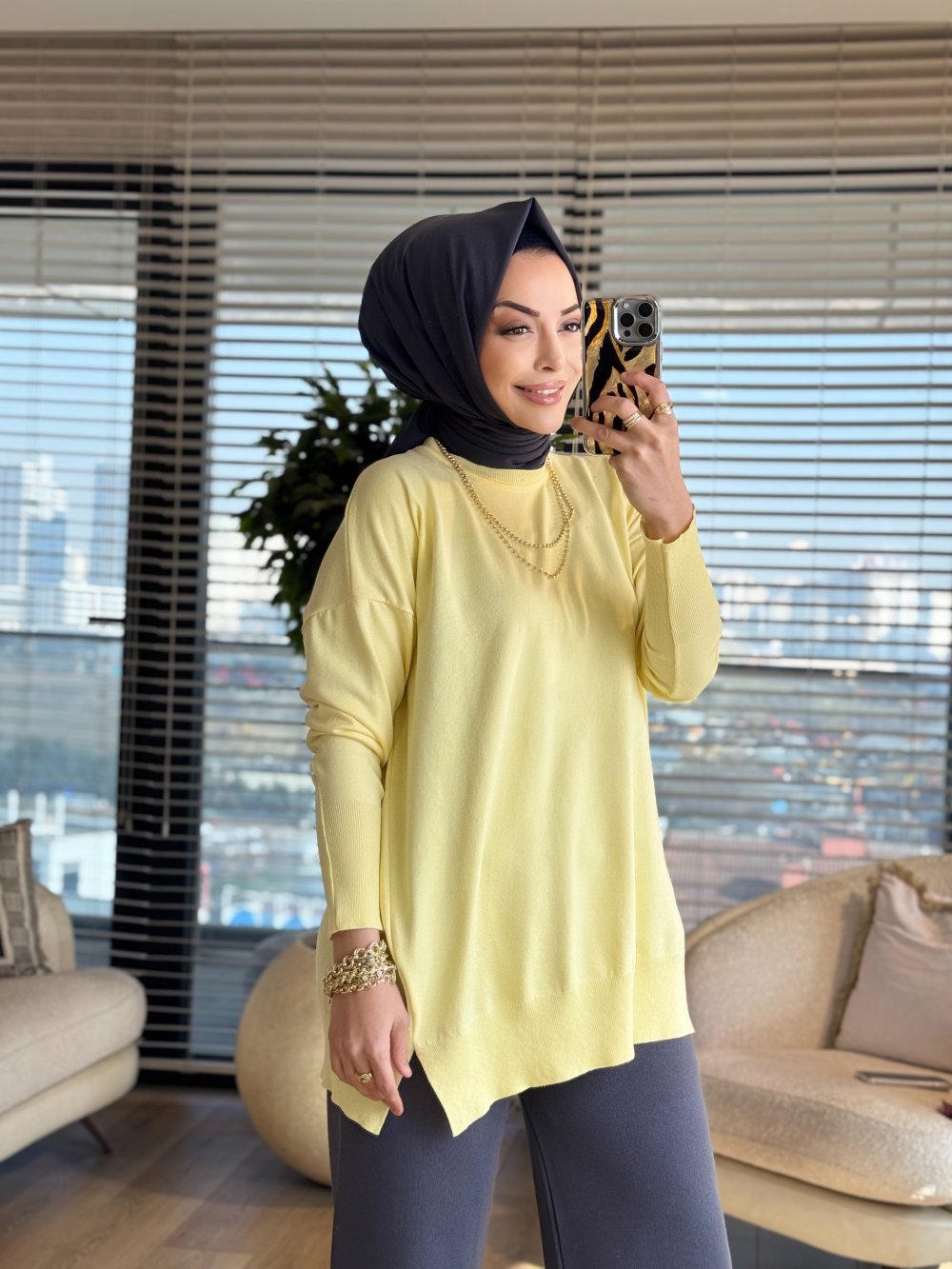 44016 Manşeti Çıtçıtlı Triko Tunik Sarı