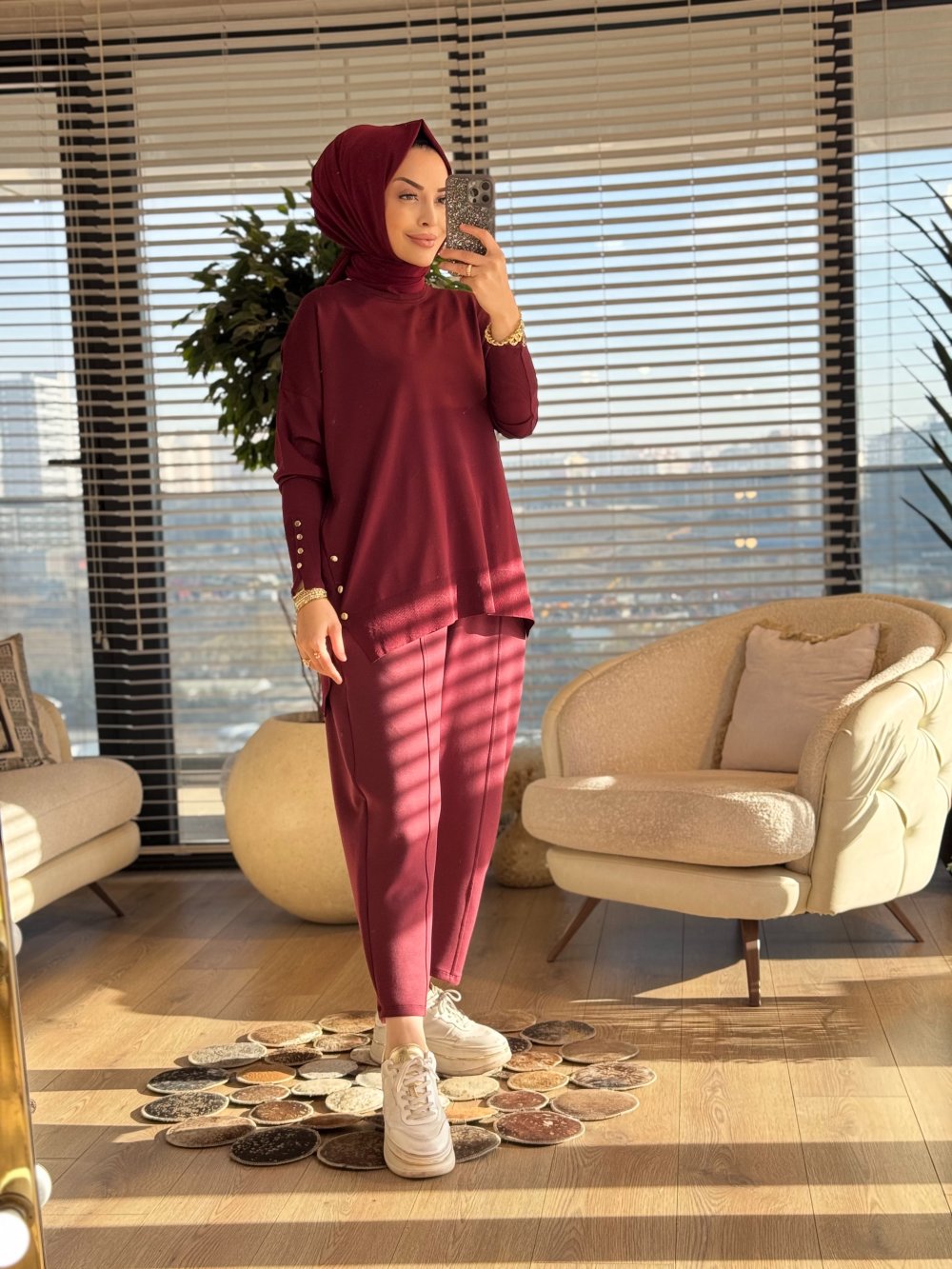 44197 Yan Ve Manşeti Düğmeli Triko Tunik Bordo