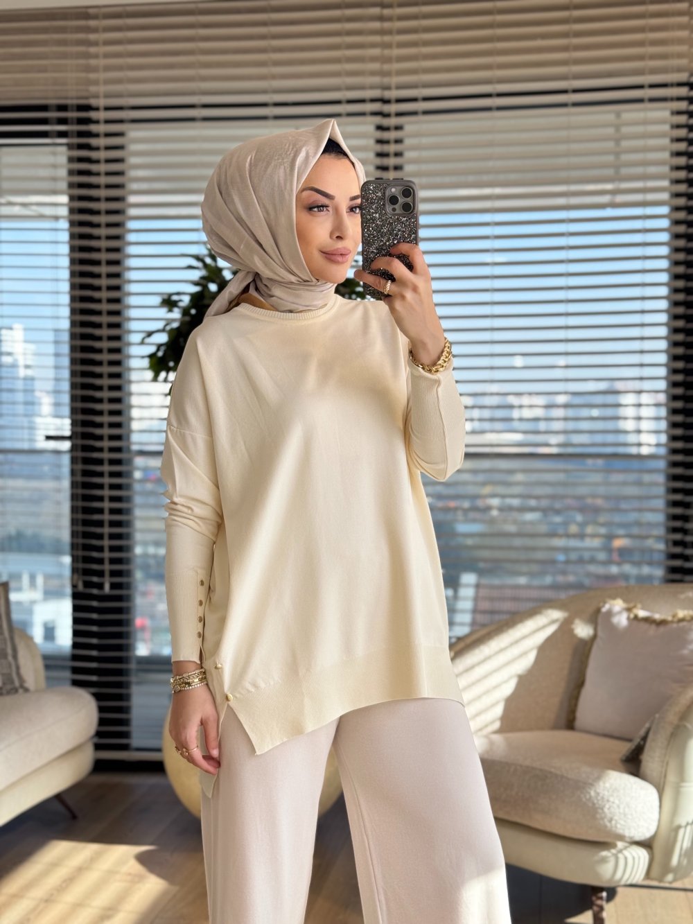 44197 Yan Ve Manşeti Düğmeli Triko Tunik Ekru