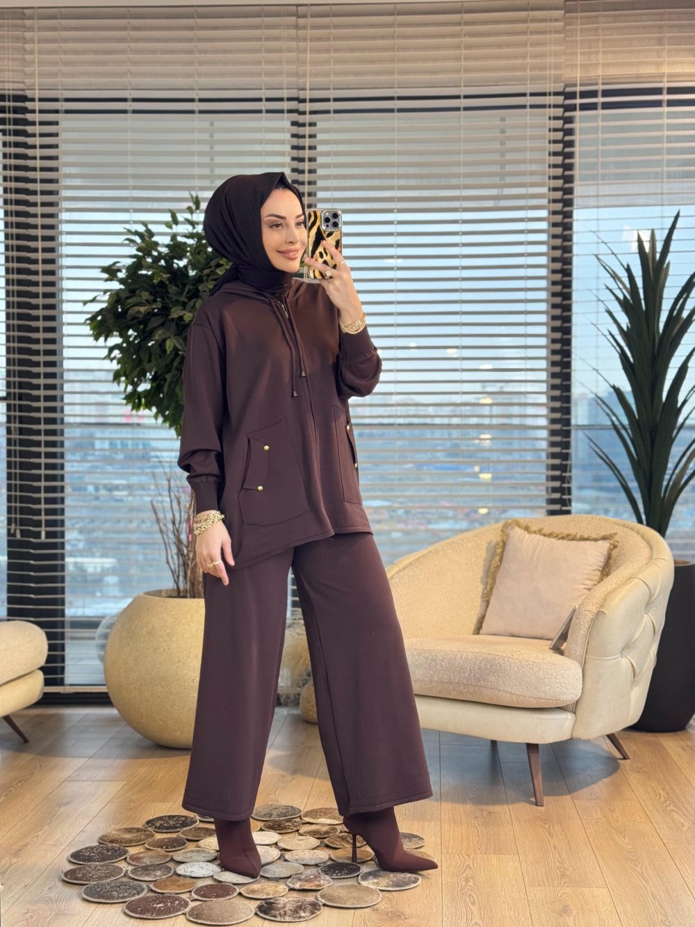 44226 Önü Cep Detaylı Kapşonlu Triko Takım Kahve
