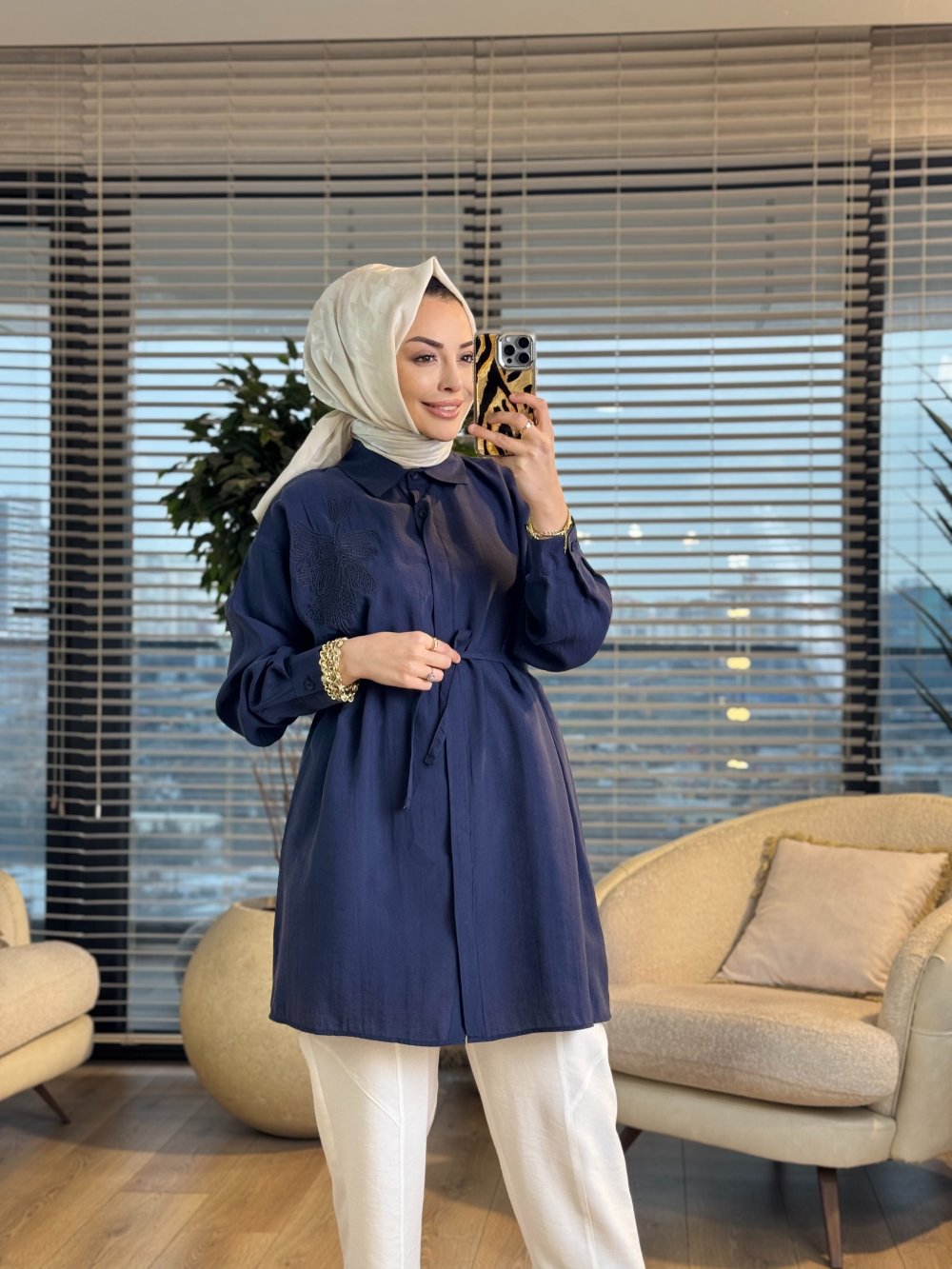 4471 Sol Göğüs Kordon Çiçek Nakışlı Gömlek Lacivert