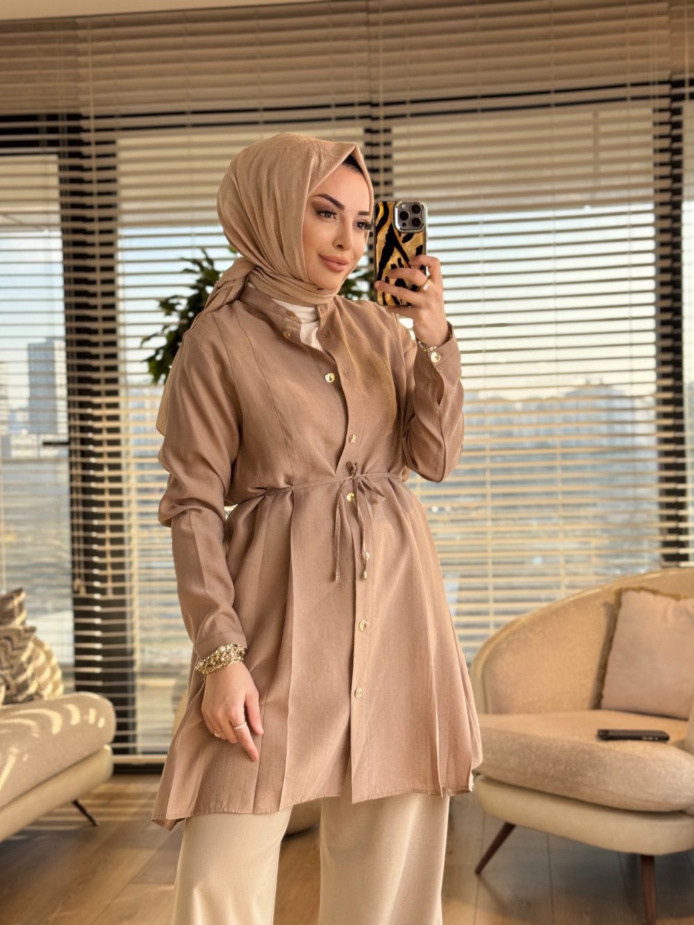 4475 Ön Dikiş Pile Detaylı Tunik Bej