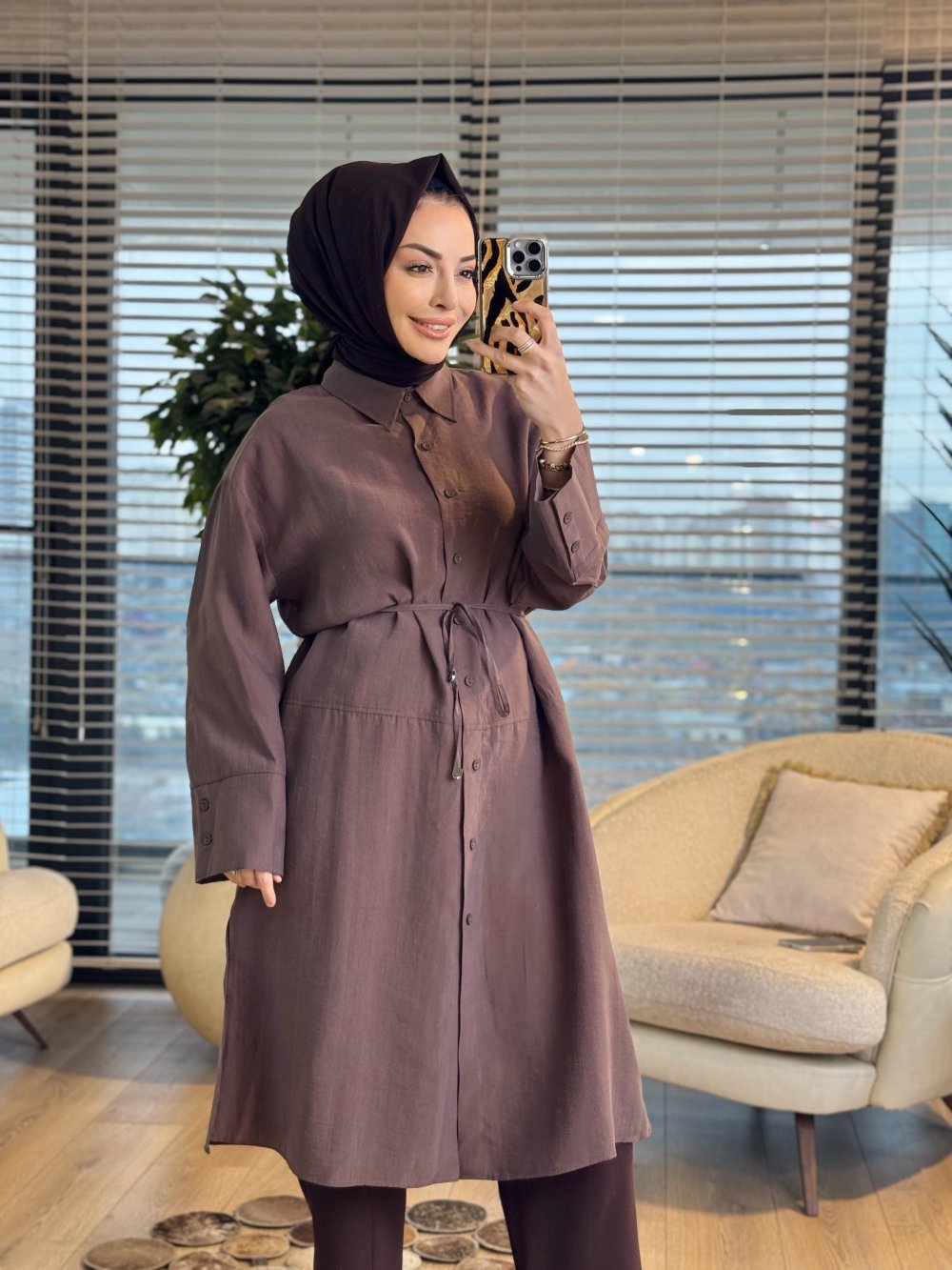 4476 Ön Düğmeli Klasik Uzun Gömlek Kahve