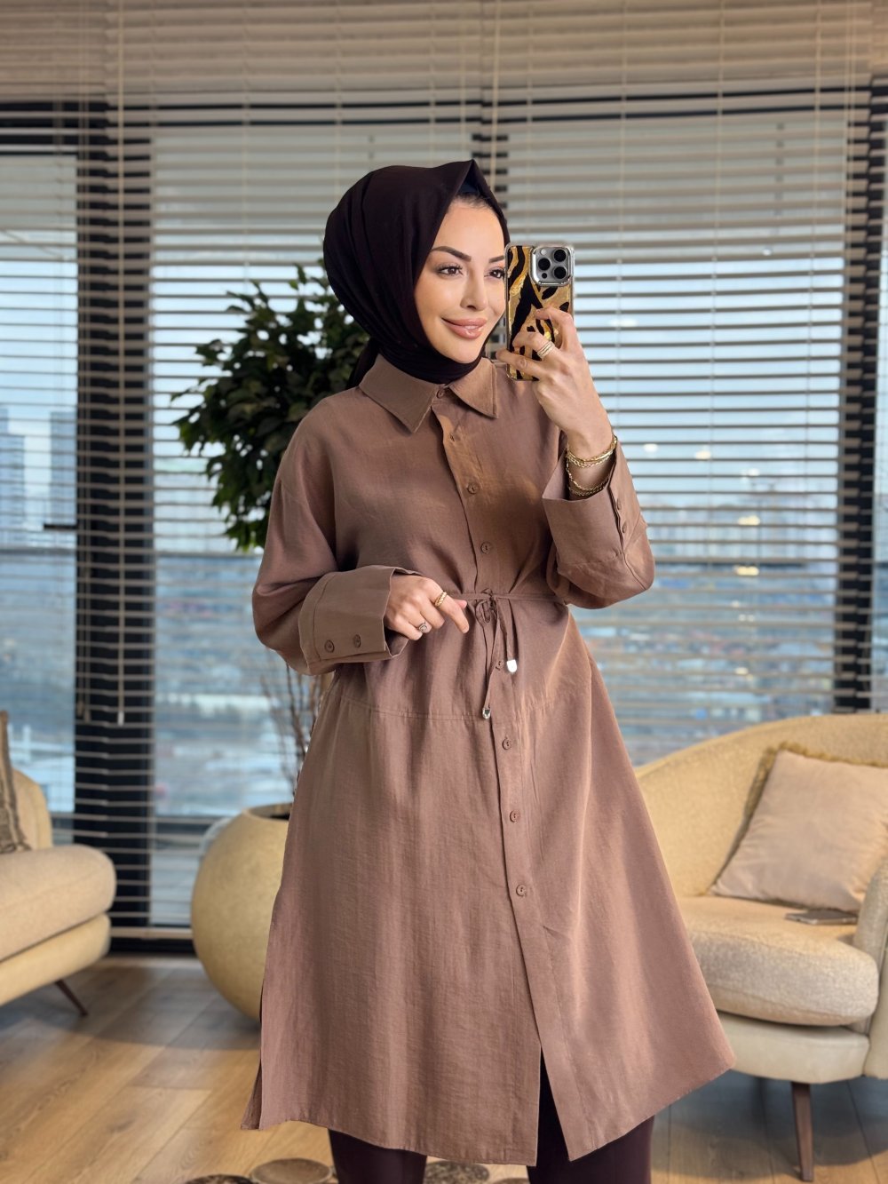4476 Ön Düğmeli Klasik Uzun Gömlek Vizon