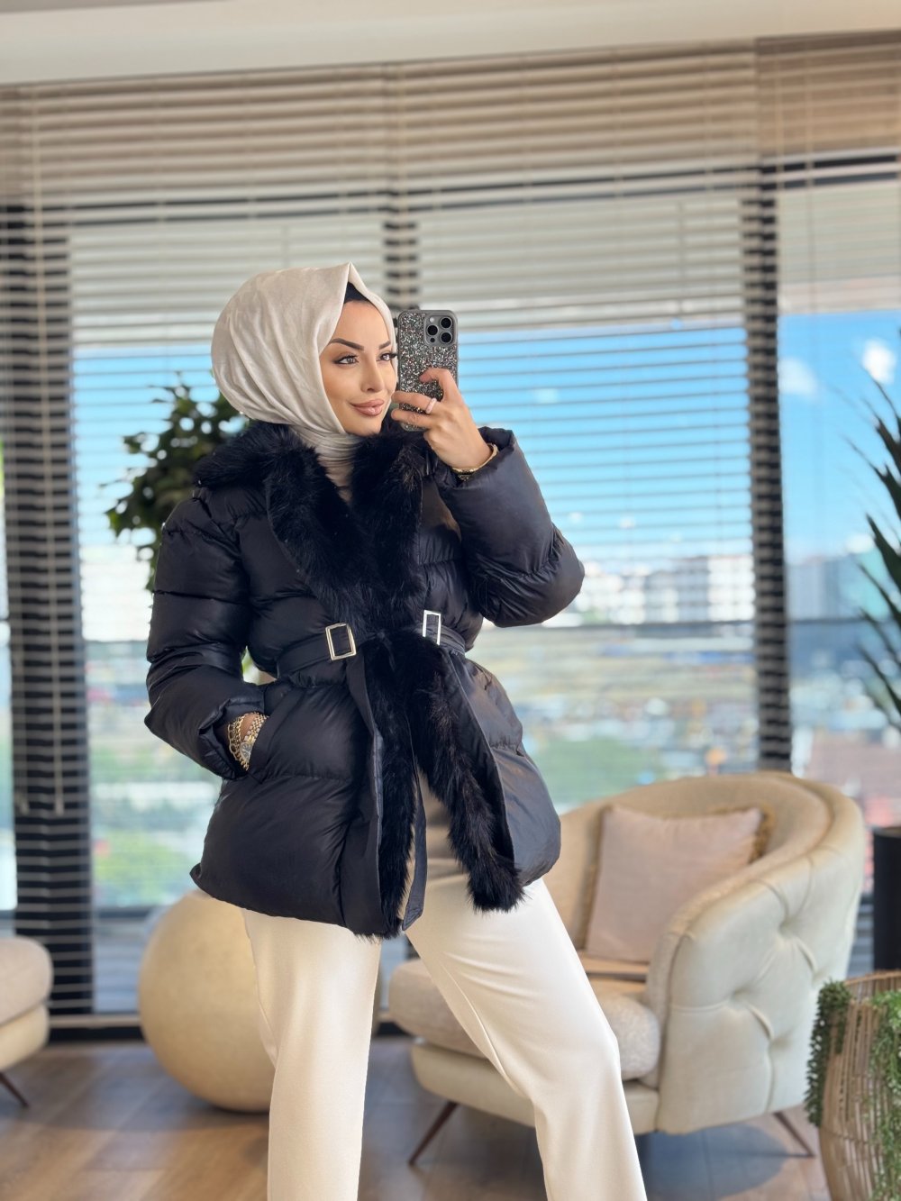 4605 Yakası Kürklü Şişme Kısa Kaban Siyah