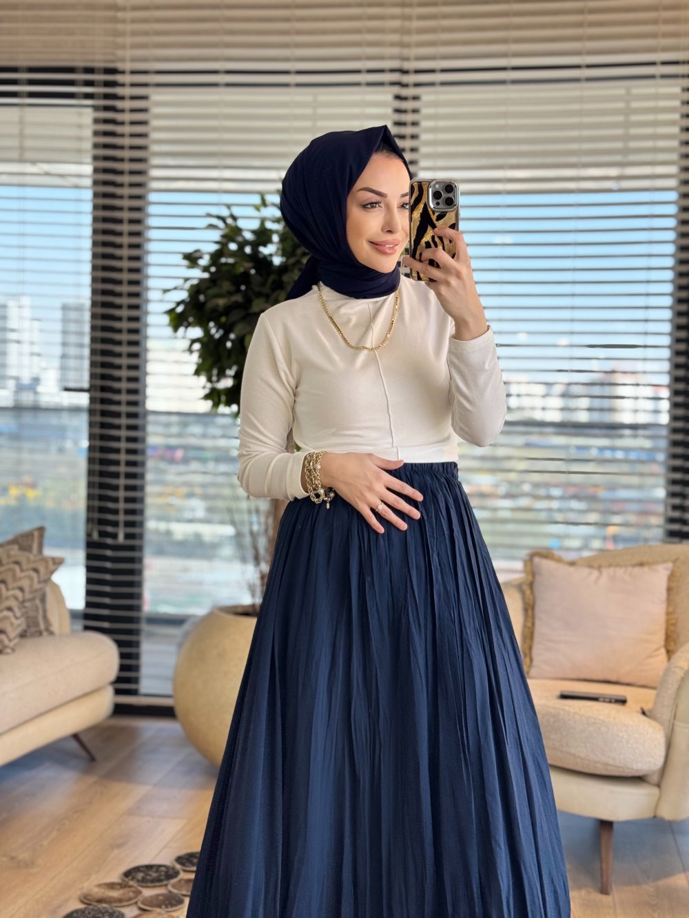 5004 Beli Lastikli Kırışık Etek Lacivert