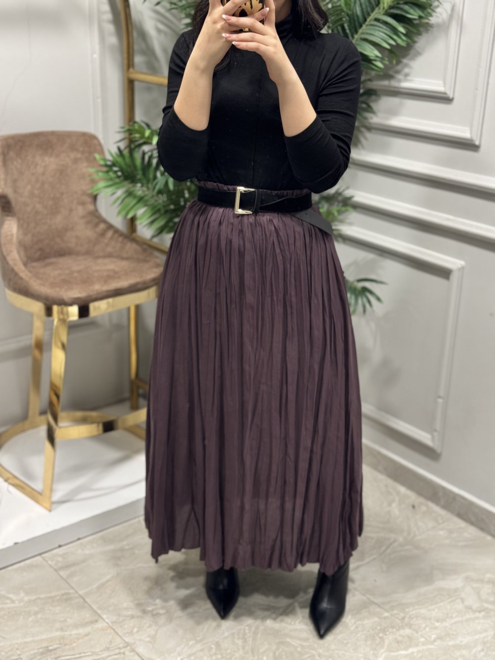 5004 Beli Lastikli Kırışık Etek Mürdüm
