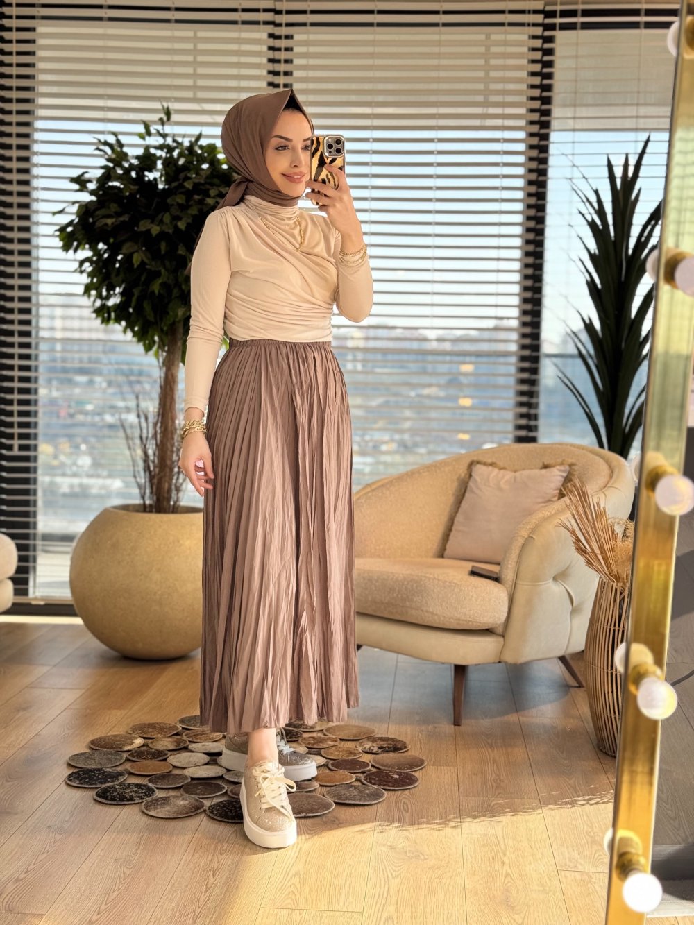 5004 Beli Lastikli Kırışık Etek Vizon