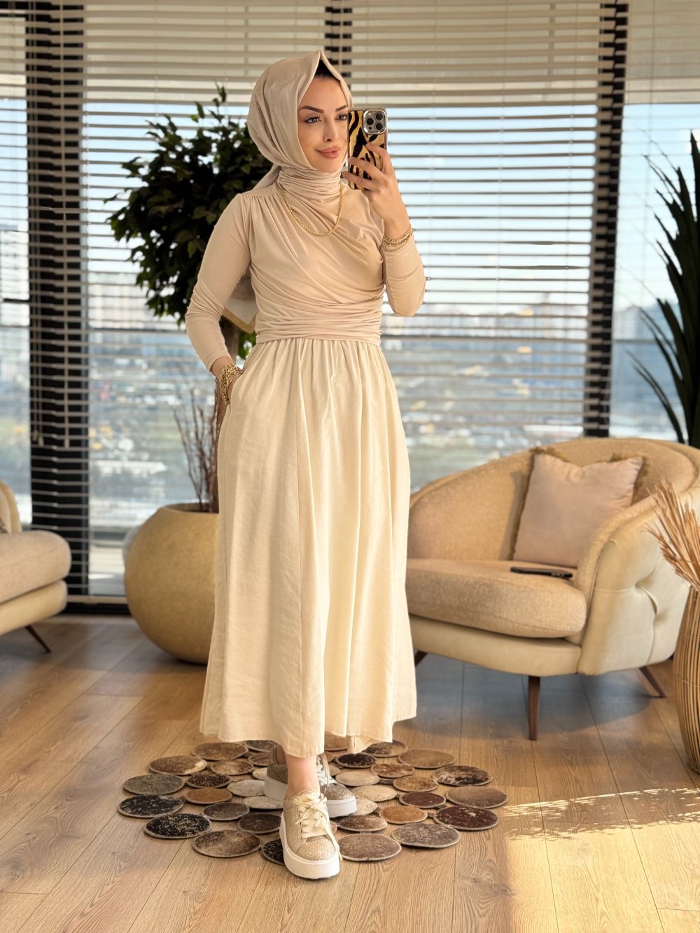 5036 Beli Lastikli Cepli Kırışık Etek Bej