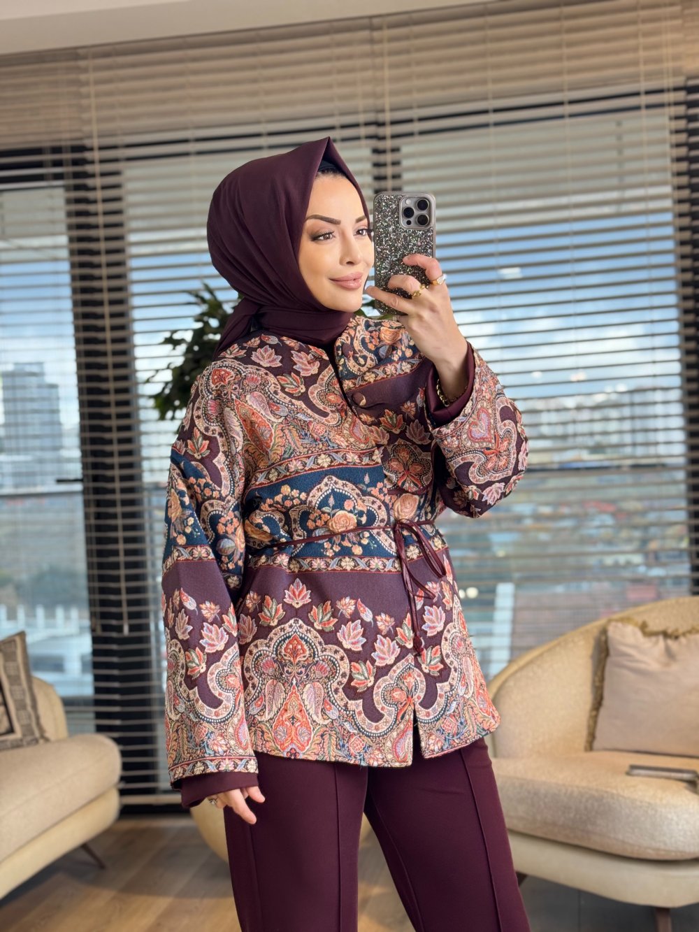 51199 Etnik Desen Jakarlı Ceket Bordo