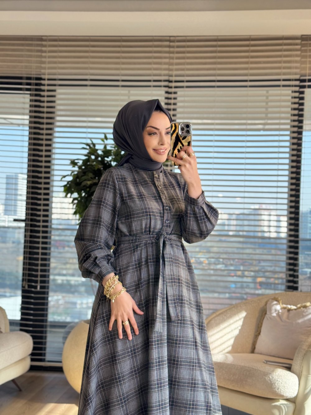 51272 Ekose Patı Düğmeli Elbise Gri