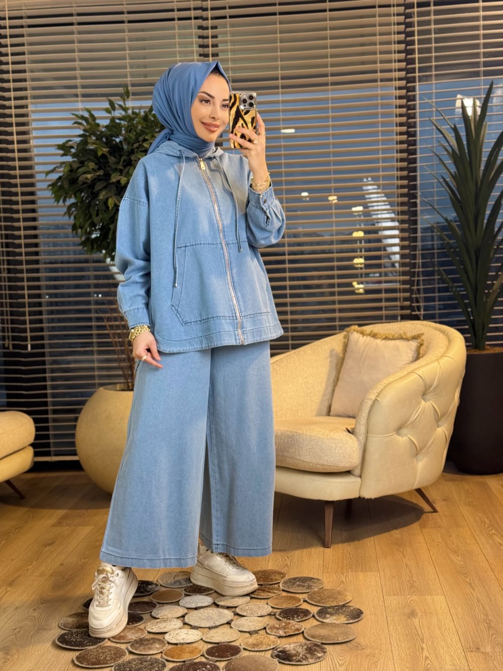 6036 Kapşonlu Fermuarlı Tencel Takım Mavi