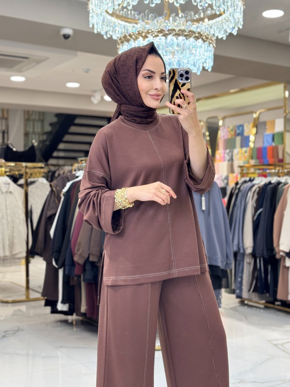 6070 Ön Ve Etek Ucu Dikiş Detaylı Takım Kahve