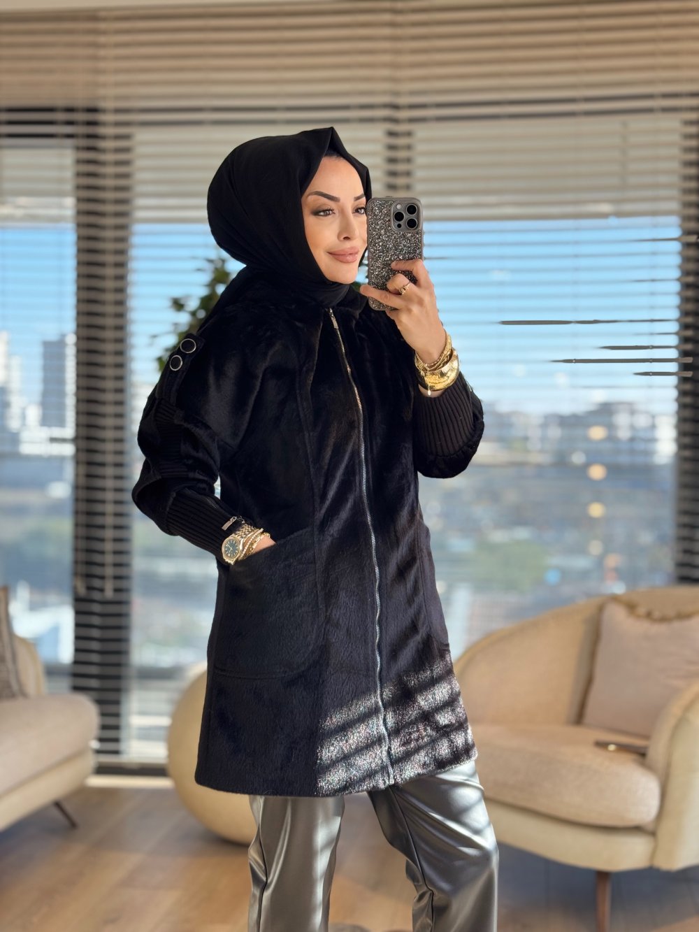 70027 Angora Omuzları Apoletli Kaban Siyah