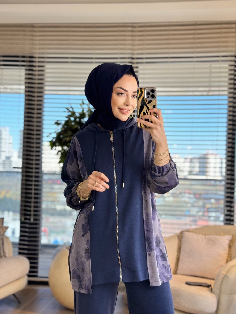 70081-2 Yanları Desenli Kapşonlu Takım Lacivert