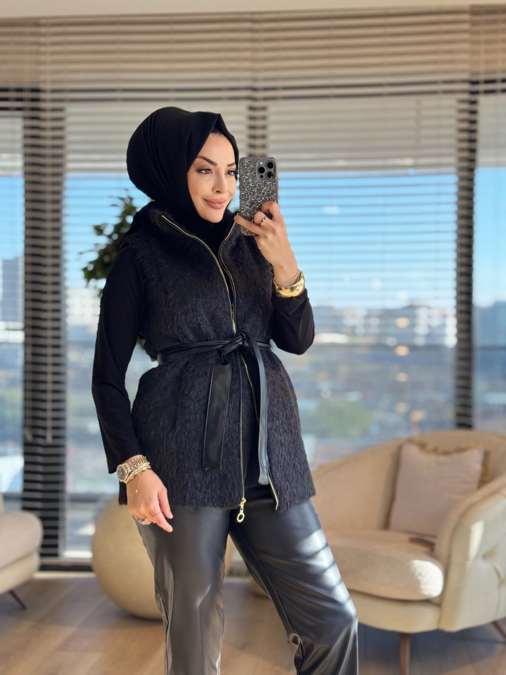 70083 Saçak Önden Fermuarlı Yelek Siyah