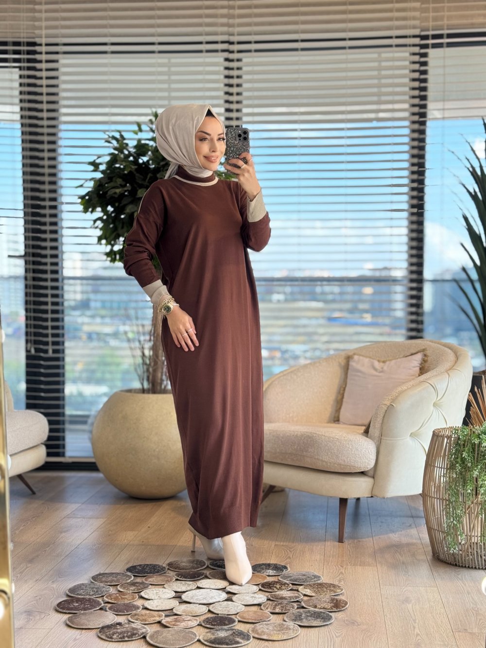 7032 Omuzu Manşetli Garnili Triko Elbise Kahve