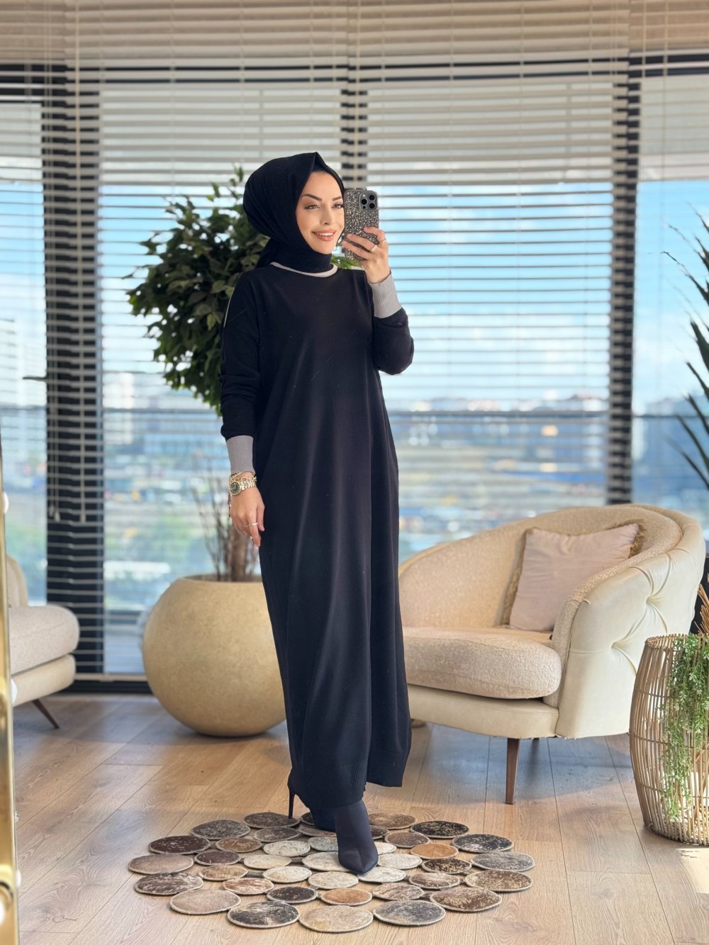 7032 Omuzu Manşetli Garnili Triko Elbise Siyah