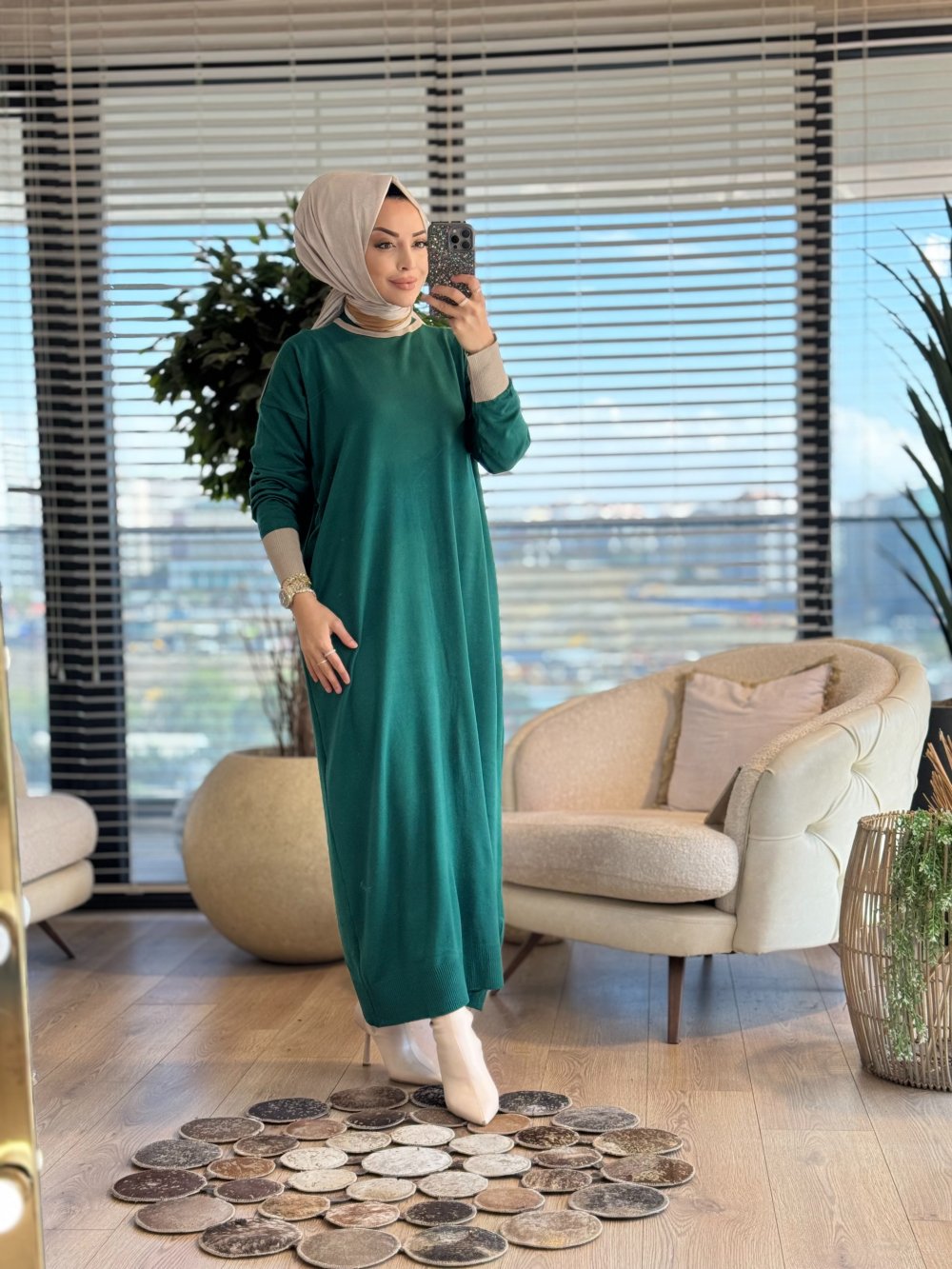 7032 Omuzu Manşetli Garnili Triko Elbise Zümrüt