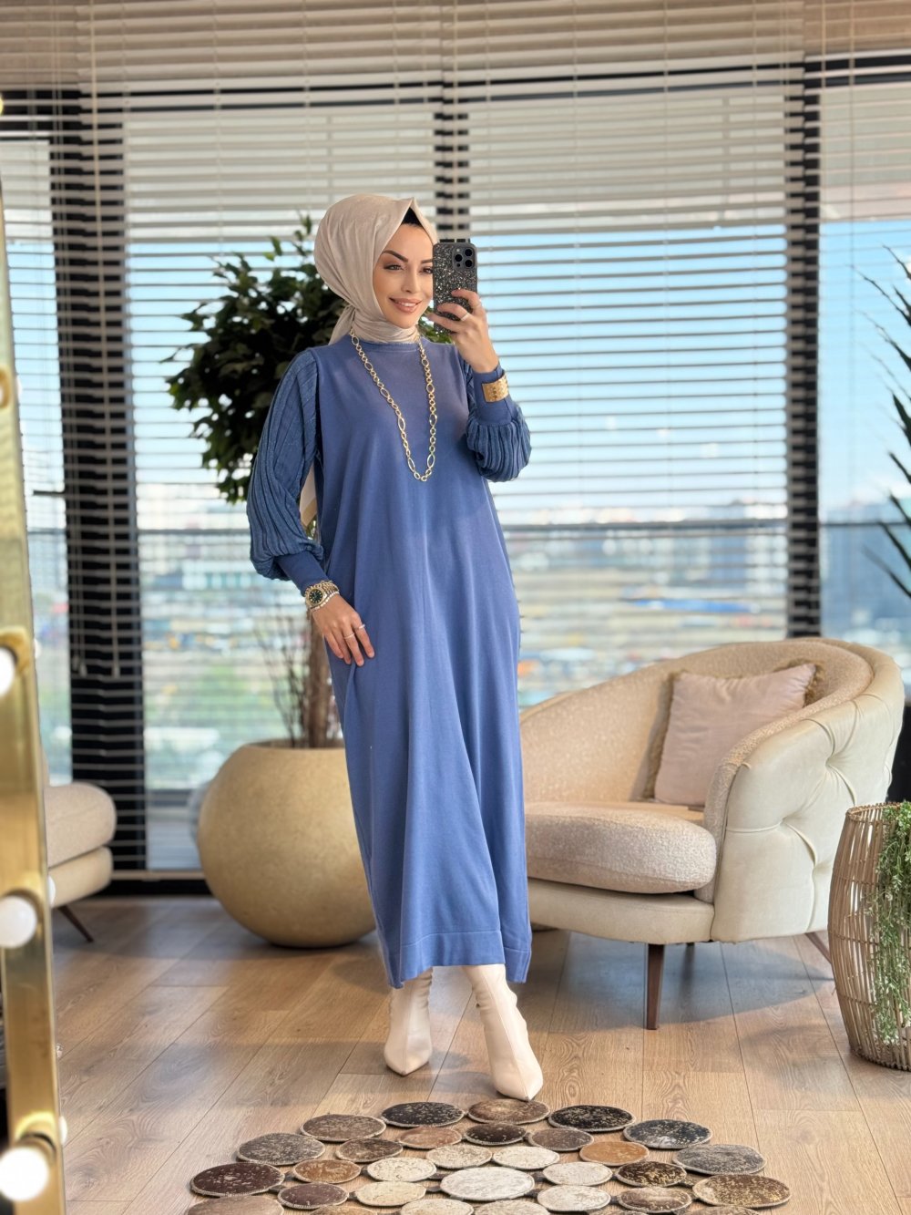 7046 Kolları Piliseli Simli Vanezia Elbise İndigo