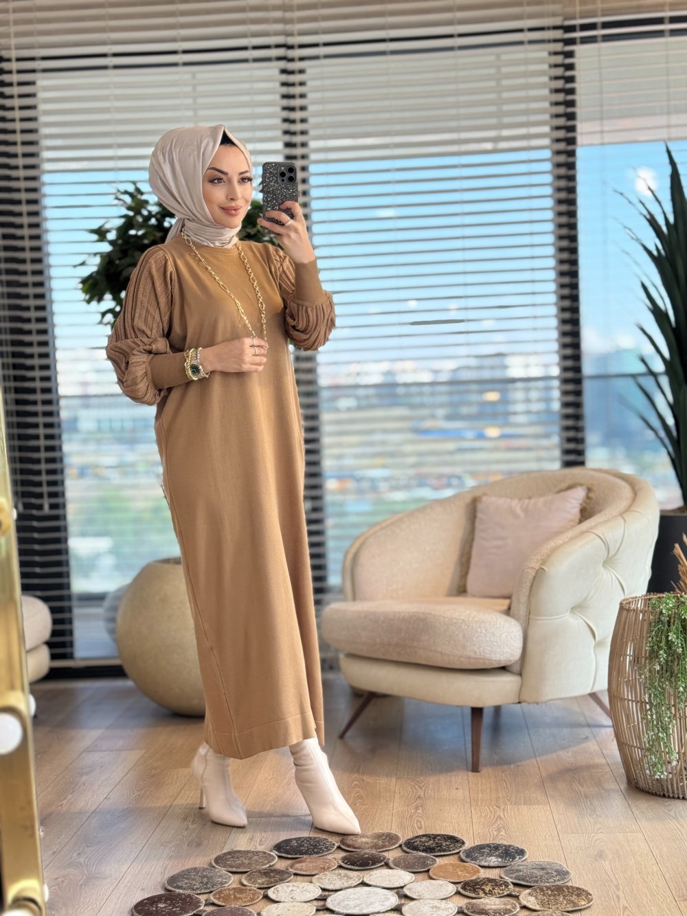 7046 Kolları Piliseli Simli Vanezia Elbise Latte