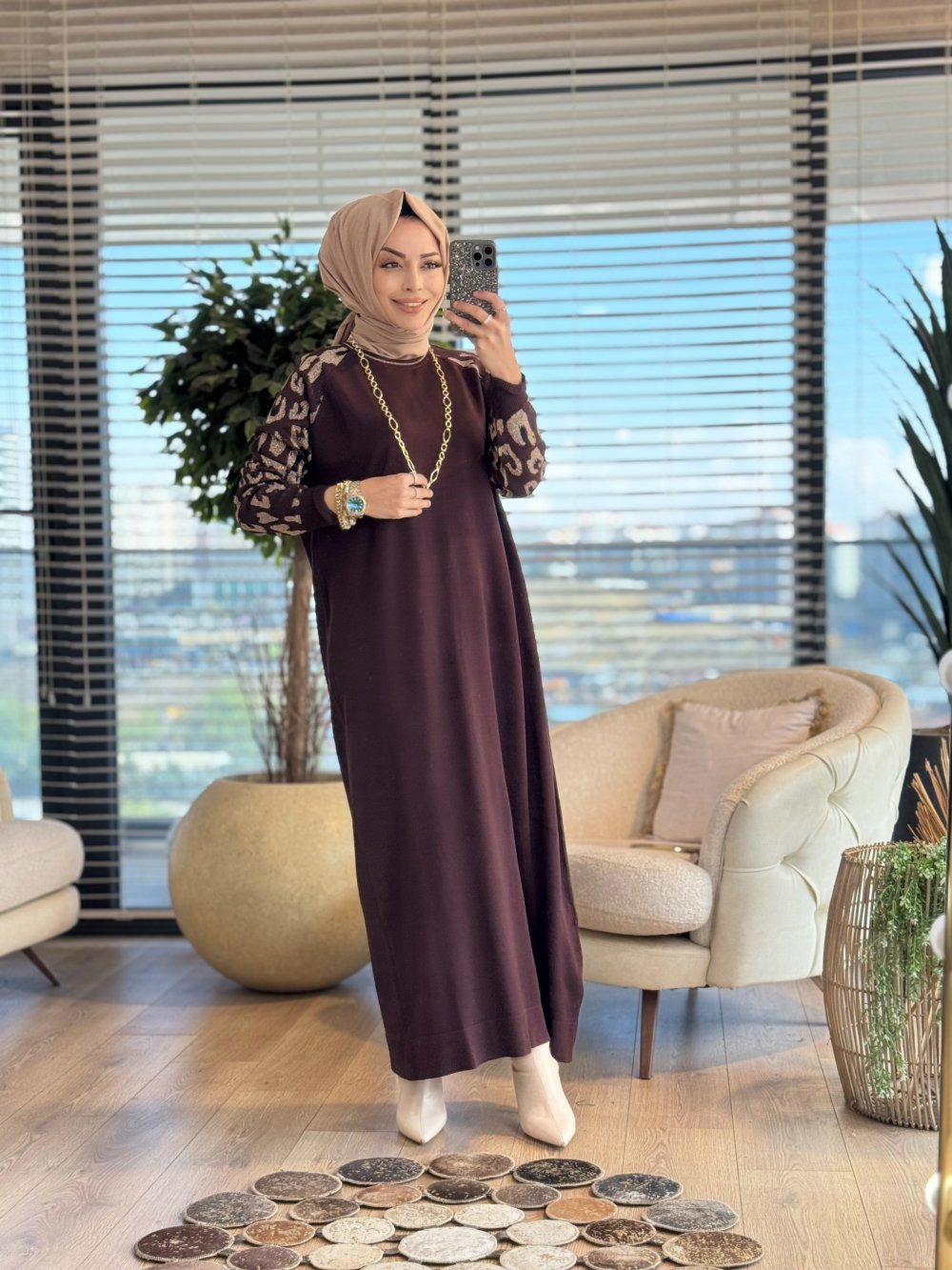 7050 Kolları Leoparlı Vanezia Elbise Kahve