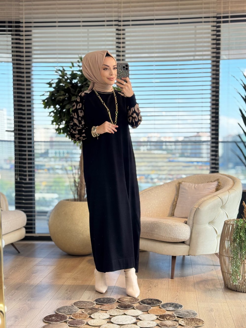 7050 Kolları Leoparlı Vanezia Elbise Siyah