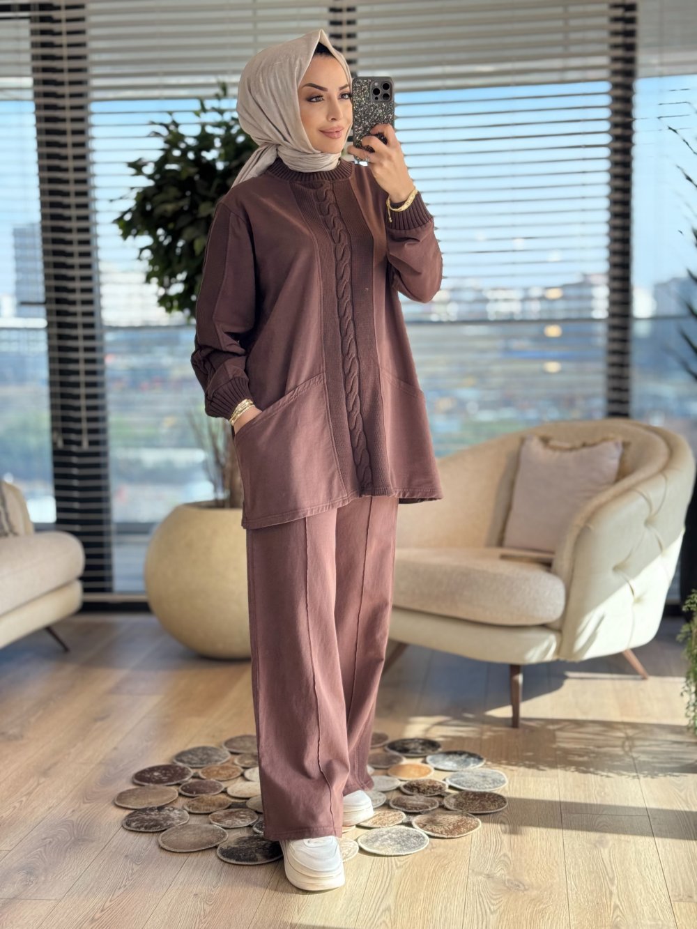 7159 Ön Ve Kolu Saç Örgülü Takım Kahve