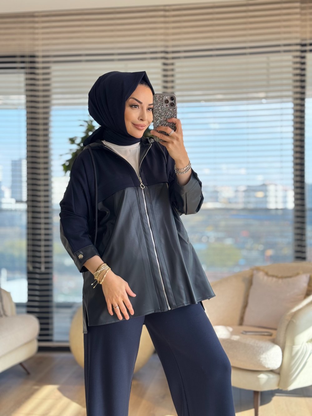 72093 Önü Ve Kapşonu Deri Detaylı Takım Lacivert