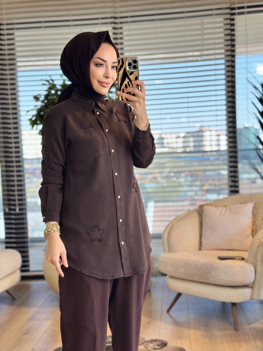 7343 Tencel Üstü Serpme Yıldız Nakışlı Gömlek Kahve