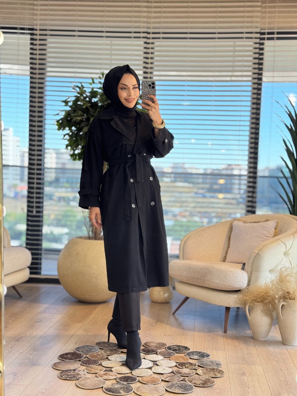 7407 Altı Düğmeli Kot Trenç Siyah