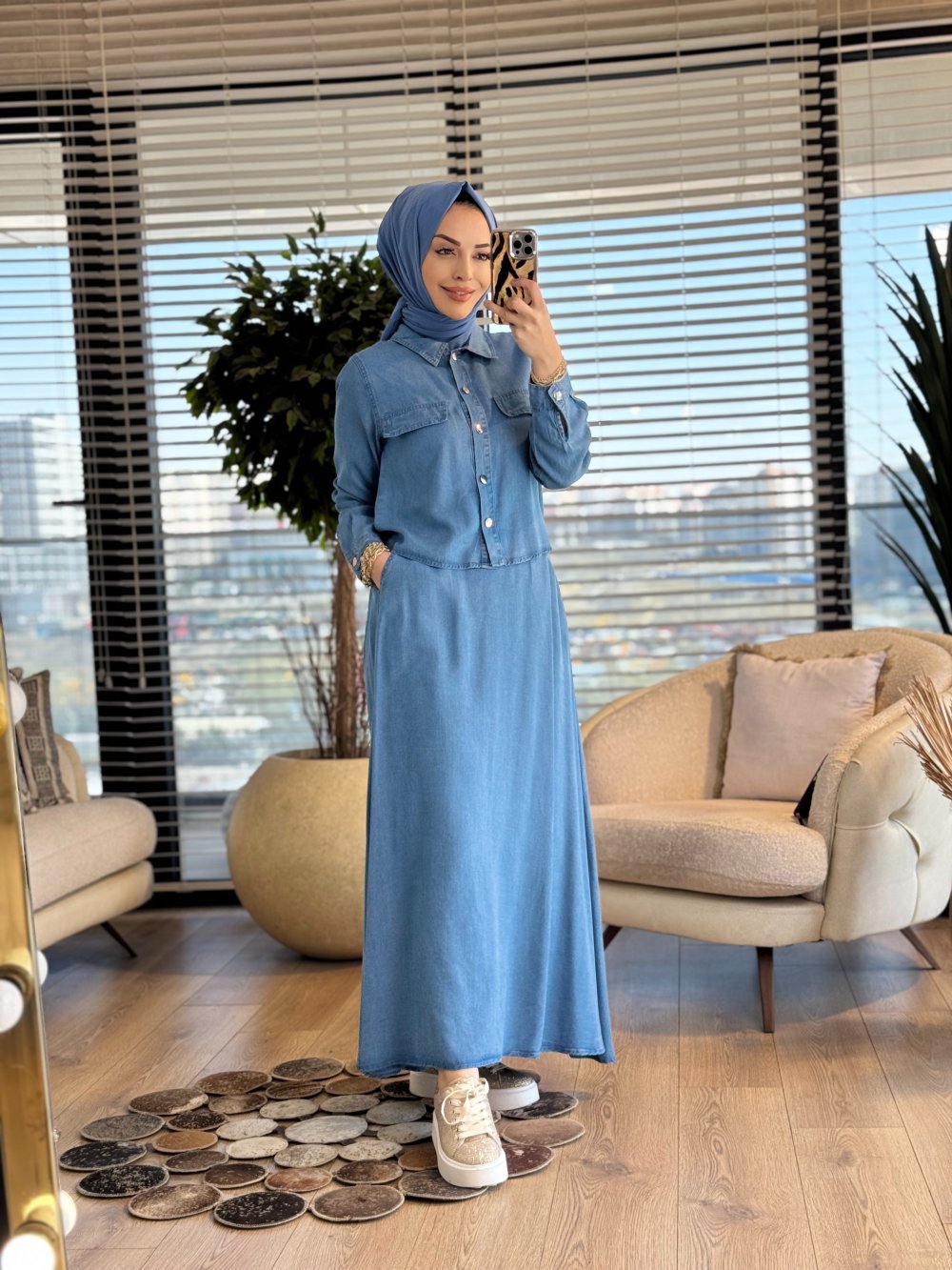 7427 Tencel Metal Düğmeli Etekli Takım Mavi