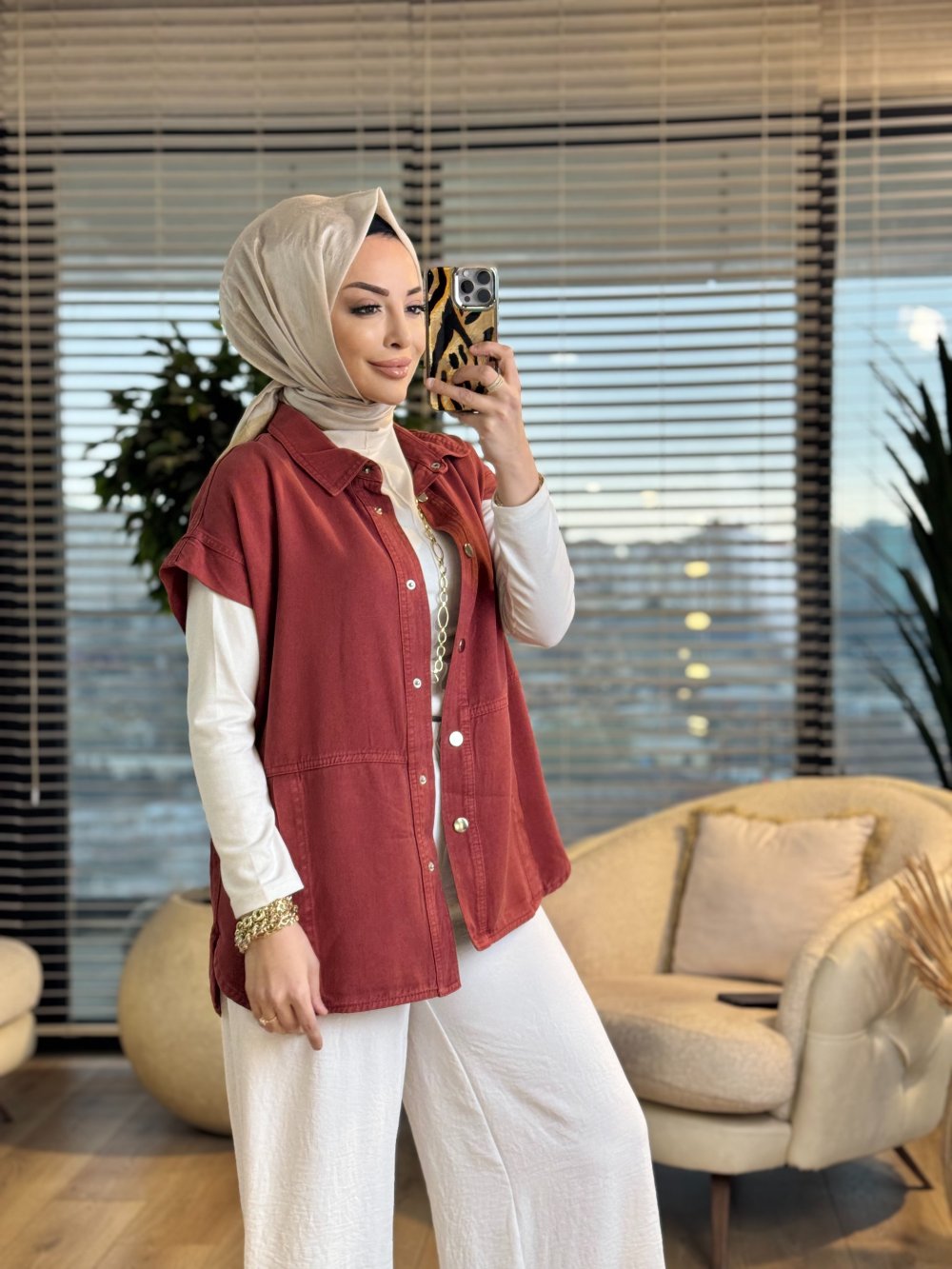 7441 Tencel Ön Dikişli Ve Cepli Yelek Kiremit